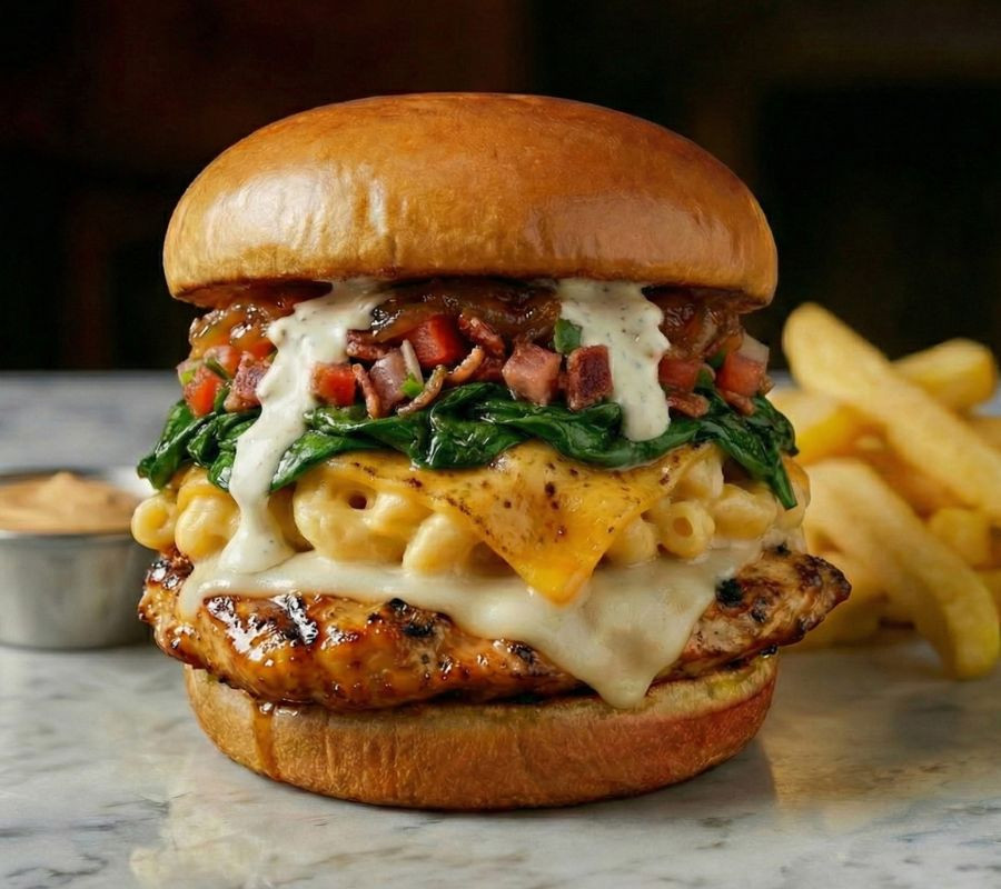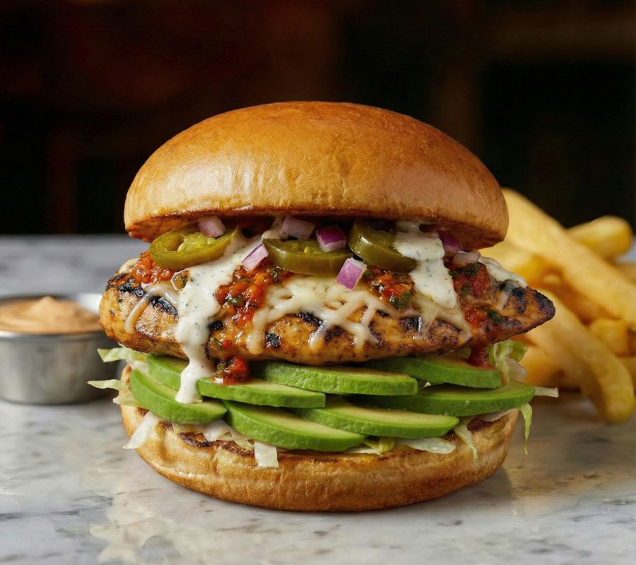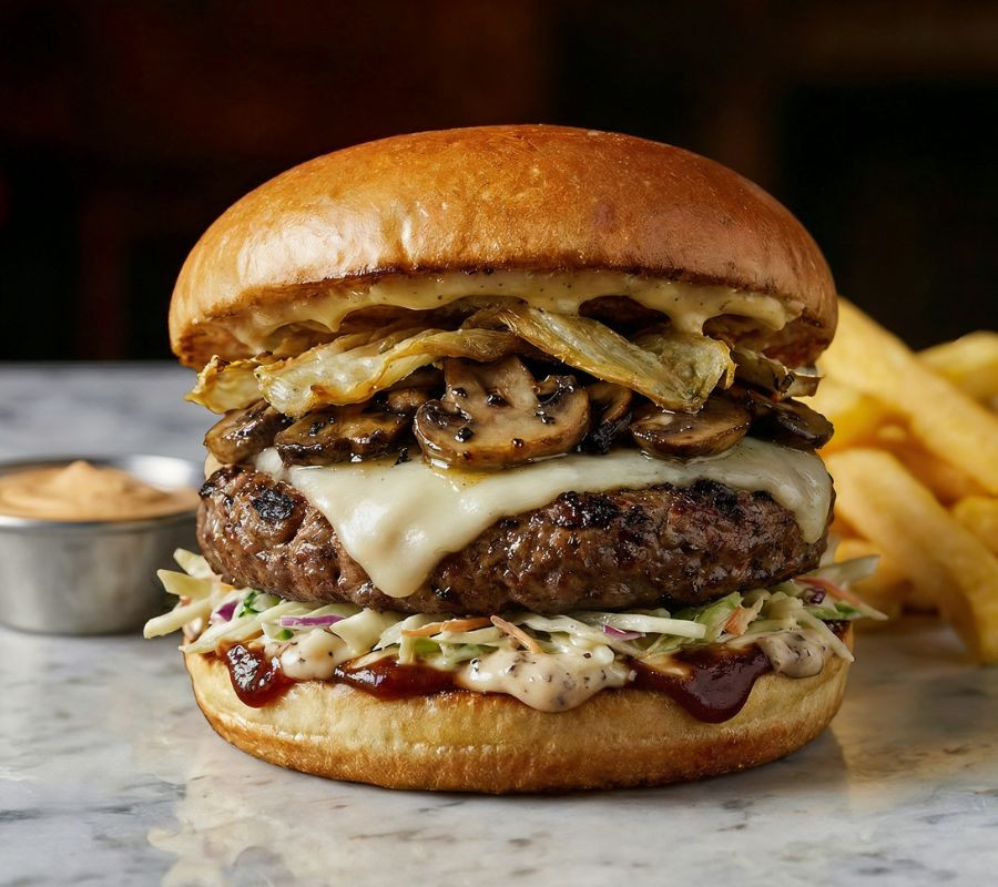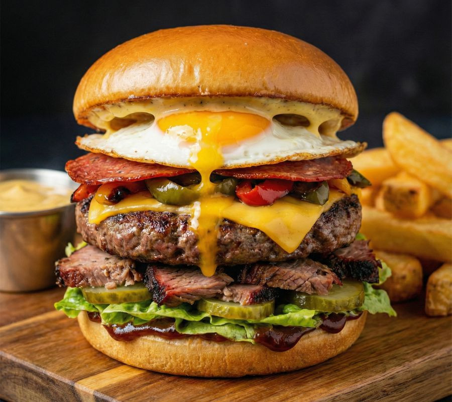 Grab mouth-watering burger stacked with all your favorite toppings, a true masterpiece of flavor!